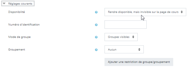 Méthode 1ProcédureRendre un élément furtif : méthode 1⚓Allez dans le paramétrage de votre activité.Dans réglages courants->Disponibilité sélectionnez Rendre disponible, mais invisible sur la page de cours.